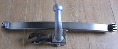 Het roestvrijstalen deel wordt aan het bladveer bevestigd. Sterke contructie die onder de Fiat kan blijven zitten.Zo kan de aluminium trekstang eenvoudig onder het voorfront gemonteerd worden. Als de trekstang lang niet gebruikt wordt kan eventueel het koker- frame verwijderd worden. Maar de beugels aan het bladveer laten zitten. Zo kan het Koker-frame gemakkelijk terug geplaatst worden.